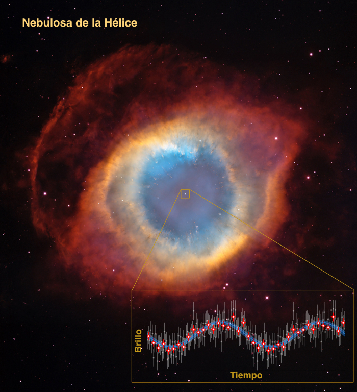 En el presente estudio, liderado por Alba Aller Egea, investigadora del Centro de Astrobiología, y recientemente publicado en la revista Astronomy & Astrophysics, se han utilizado datos del telescopio espacial TESS (Transiting Exoplanet Survey Satellite, Satélite de búsqueda de exoplanetas en tránsito) para detectar estrellas binarias en el núcleo de varias nebulosas planetarias. “De las ocho estrellas centrales de nebulosas planetarias analizadas, siete muestran claros signos de variabilidad, compatible en la mayoría de los casos con la presencia de una estrella compañera. La octava, que no parece tener variabilidad al menos en los 27 días en los que se han tomado los datos, es la única nebulosa planetaria aparentemente esférica de la muestra, algo que corroboraría la teoría de la binariedad”, señala Aller. De especial interés son los resultados obtenidos para la nebulosa de la Hélice (en la imagen). Esta nebulosa es una de las más estudiadas y también una de las más cercanas a la Tierra (a unos 650 años luz). Como indica Aller, “gracias a los datos de TESS detectamos, por primera vez, una clara variabilidad en la luz que nos llega de su estrella central (lo que llamamos curva de luz, ver imagen). Esta variabilidad podría ser consistente con la presencia de una estrella compañera de baja masa o un objeto subestelar (como una enana marrón o un exoplaneta), que podría estar reflejando la luz de la estrella primaria, mucho más caliente. El periodo de dicha señal es de 2,8 días, que sería, de confirmarse esa estrella compañera, el tiempo en que ambas estrellas orbitarían la una alrededor de la otra”