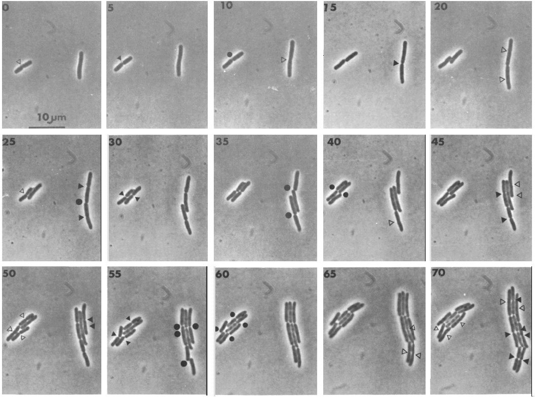 División de dos bacterias según se ve al miscroscopio. A diferencia de la mayoría de las células de nuesto cuerpo las bacterias como E. coli están genéticamente programadas para multiplicarse sin cesar y muy rápidamente. Incluso si por error (como le debió ocurrir a la bacteria que aparece a la derecha de cada secuencia, ya que es anormalmente larga) se salta una división luego la recupera. Las cifras son los minutos a los que se tomó cada foto. Cullum and Vicente, 1978. J. Bacteriol. 134: 330-337.