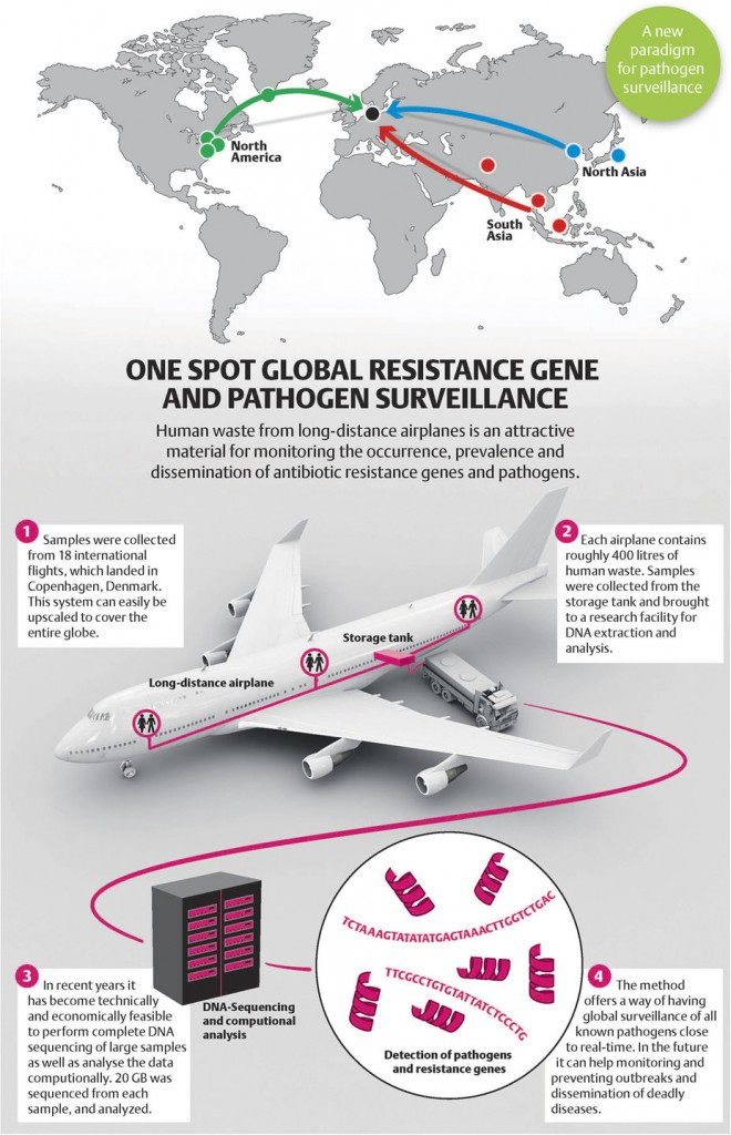 Petersen et al., 2015. Meta-genomic analysis of toilet waste from long distance flights; a step towards global surveillance of infectious diseases and antimicrobial resistance. Sci Rep. 5:11444. doi: 10.1038/srep11444.