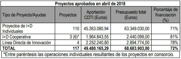 El Consejo de Administración del Centro para el Desarrollo Tecnológico Industrial (CDTI), Entidad Pública Empresarial (E.P.E.) dependiente del Ministerio de Economía, Industria y Competitividad, ha aprobado 117 nuevos proyectos de I+D+I con un presupuesto total que asciende a 68,68 millones de euros. El CDTI aportará 49,48 millones de euros impulsando, de esta manera, la I+D+I empresarial.