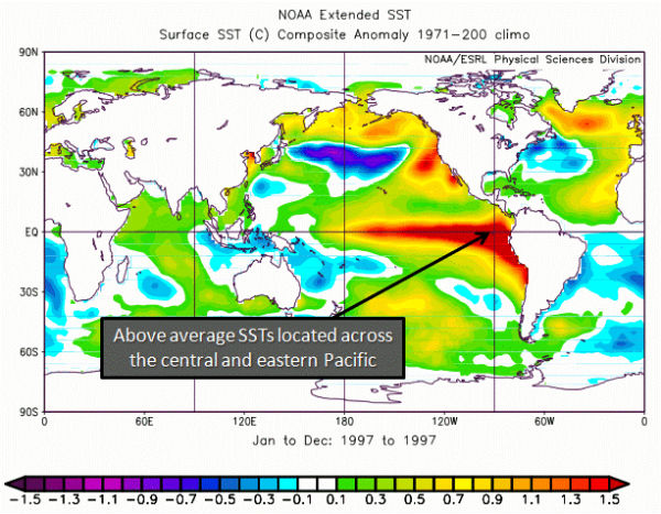 El Niño de 1997. Anomalías globales de la temperatura superficial del océano. Fuente: NOAA/ESRL