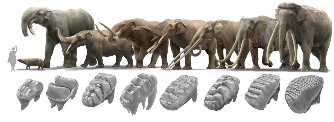 Una muestra de la enorme diversidad de formas que alcanzaron los proboscídeos, incluidos sus diferentes tipos de dentición. De izquierda a derecha, las especies se ordenan desde la más antigua a la más reciente. Ilustración de Oscar Sanisidro (Universidad de Alcalá)