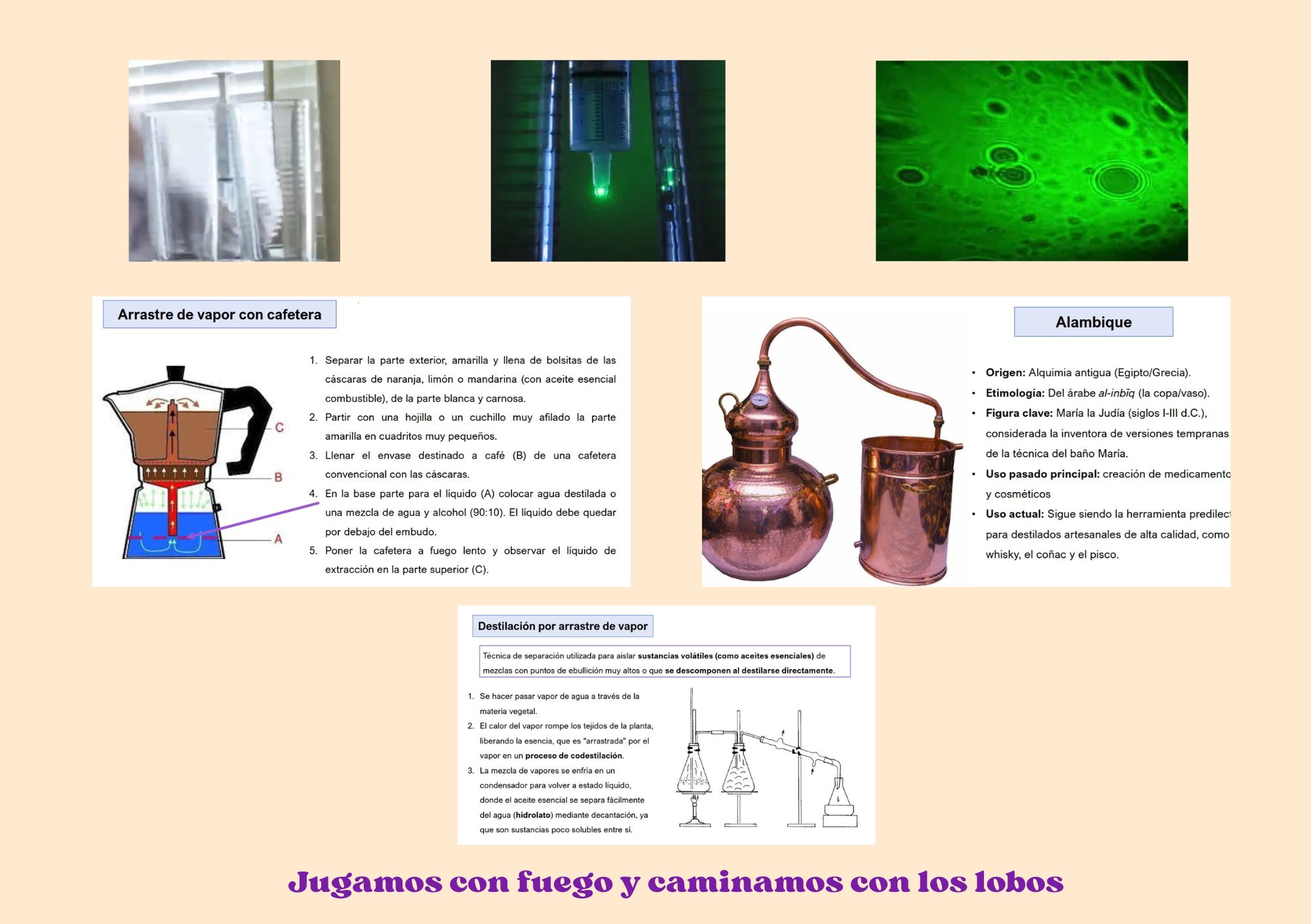 Utilizando el método de arrastre de vapor con cafetera, se pueden extraer los aceites esenciales de los cítricos, lavanda, romero, eucalipto, jara, tomillo... relacionándolo con sus posibles usos medicinales. Se puede comparar con métodos tradicionales como el alambique y con el montaje de destilación que se puede realizar en un laboratorio.