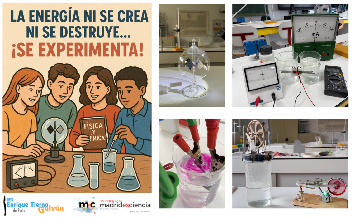 ¿Es posible generar una corriente eléctrica a partir de un vaso de agua caliente y un vaso de agua fría? ¿Es posible calentar o enfriar el agua disolviendo en ella sustancias químicas? ¿Qué son y para qué sirven los materiales semiconductores? ¿Es posible poner en marcha un motor con un vaso de agua caliente? ¿Se puede descomponer el agua con grapas y una pila? ¿Qué es la electrolisis? ¿Qué información nos proporcionan los colores de la luz emitida por los leds? ¿Se puede generar movimiento, luz y electricidad a partir de una reacción de combustión? ¿Puede la luz producir movimiento? ¿Qué es el efecto Seebeck? ¿Cómo funciona un motor Stirling? ¿Cuál es el misterio del radiómetro de Crookes? Todas estas preguntas serán respondidas por el público que visite el stand del IES Enrique Tierno Galván de Parla a través de curiosos y llamativos experimentos bajo la supervisión de nuestros fantásticos alumnos de 3.º ESO que se convertirán durante tres días en auténticos experimentadores y divulgadores científicos. Ven al stand del Tierno y sumérgete en los misterios de la física y de la química. Descubrirás que la energía ni se crea ni se destruye... ¡se experimenta! ¡Os esperamos!