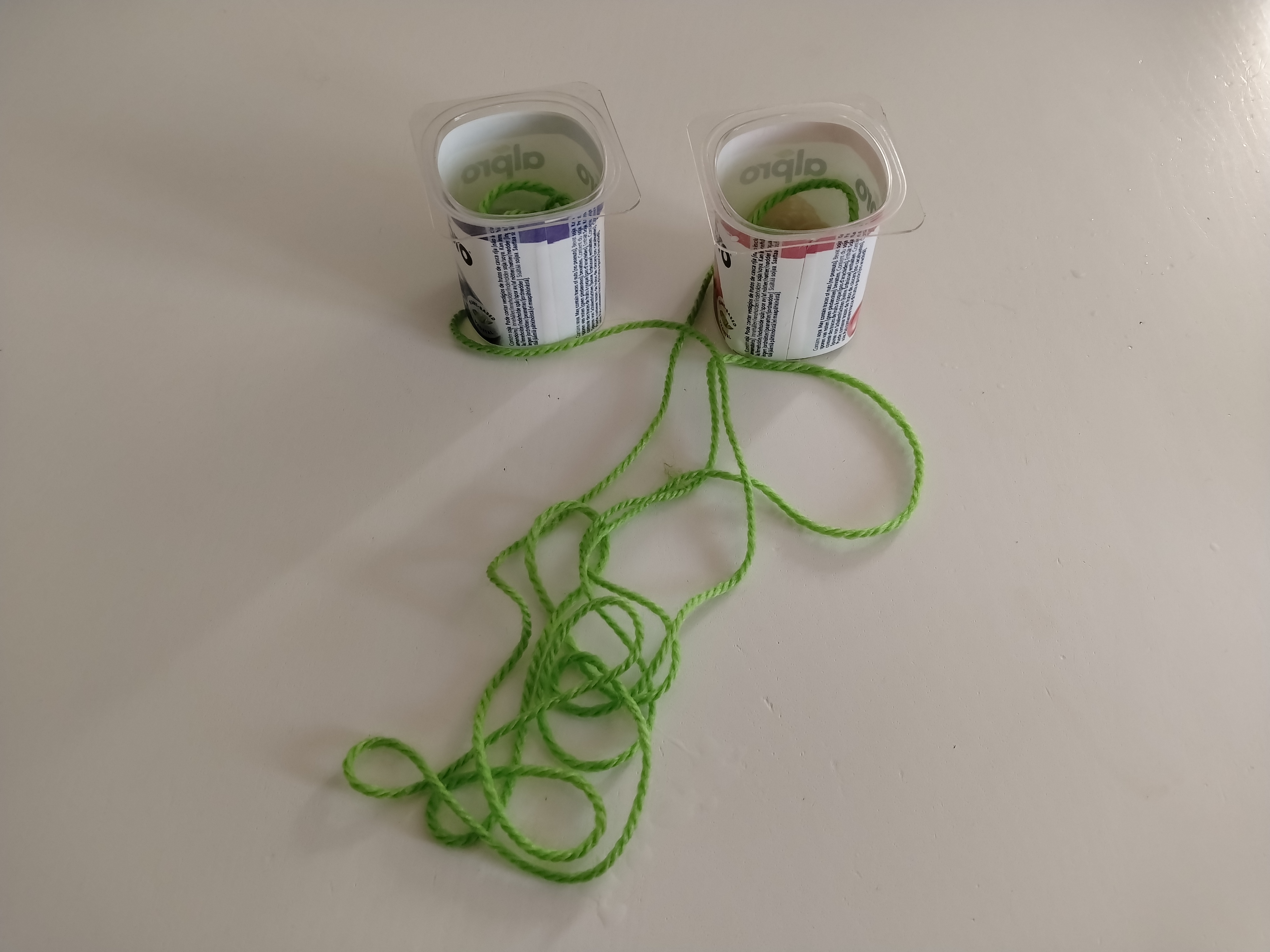 Aléjate un poco y pon tu oído en uno de los yogures. Otra persona debe hablar a través del otro yogur. ¿La escuchas? Eso es porque el sonido se transmite a través de los sólidos, en este caso la lana. Los yogures hacen de altavoces.