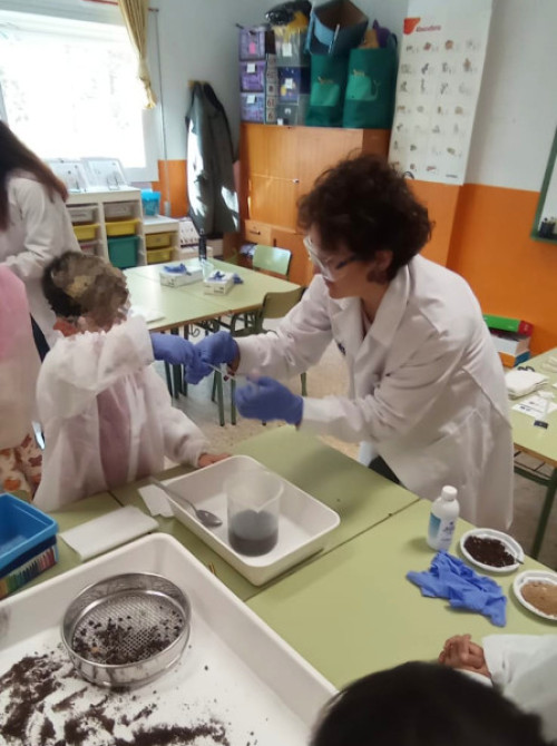 Para celebrar el Día Internacional de la Mujer y la Niña en la Ciencia se llevó a cabo una actividad de divulgación científica con niños de 6 a 7 años. El objetivo era dar a conocer la comunidad científica desde la perspectiva de dos geólogas cuyo grupo de investigación está dirigido y compuesto mayoritariamente por mujeres, centrándose en el estudio del suelo y el agua. Aprovechando el propio jardín del colegio, la actividad se desarrolló en dos partes. La primera parte consistió en una introducción teórica al método científico, utilizando un ejemplo práctico relacionado con la ciencia del suelo y la jardinería. En la segunda parte, se realizó un experimento con varias muestras de suelo. Los niños recogieron las muestras, las tamizaron, las mezclaron con agua y analizaron su contenido en nutrientes (nitrógeno, fósforo y potasio) utilizando kits de pruebas colorimétricas para determinar qué suelo tenía los niveles más altos de nutrientes y era, por tanto, el más adecuado para plantar en el jardín. Actividad realizada gracias a la ayuda PTA2020-019363-I financiada por MCIN/AEI/10.13039/501100011033 y por ESF Invierte en tu futuro).