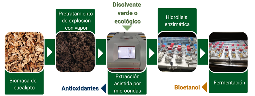 Esquema del proceso para obtener antioxidantes y mejorar la producción de bioetanol a partir de biomasa de eucalipto usando disolventes verdes. Fuente: Raquel Cañadas. UPM.