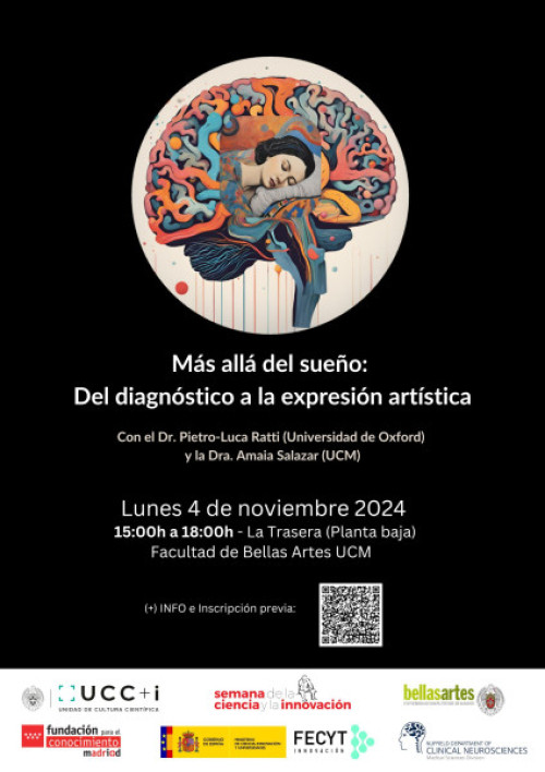Más allá del sueño: del diagnóstico a la expresión artística Cursos y talleres ◄Atrás Plazas disponibles Fechas y horario Lun, 4 Nov 2024 de 15:00 a 18:00 📅 Añadir a mi calendario Lugar Actividad presencial Facultad de Bellas Artes, La Trasera. C. Pintor el Greco, 2, Moncloa - Aravaca, 28040 Madrid Temáticas destacadas Imágenes de la Ciencia Disciplinas Historia, Arte y Arqueología Medicina Público al que va dirigido Público infantil 1-2 primaria 3-4 primaria 5-6 primaria 1-2 ESO 3-4 ESO Estudiantes Bachillerato Estudiantes Ciclos Formativos Público universitario Público general Público individual Grupos organizados Personas > 65 años Correo de información amaiasal@ucm.es Descripción El taller aborda la fisiología del sueño y el trastorno de conducta del sueño REM, ligado a enfermedades neurodegenerativas. Incluye una simulación de estudio del sueño en vivo para mostrar la adquisición de señales fisiológicas. Los estudiantes debatirán y crearán una obra artística basada en el tema Organiza Departamento de Escultura y Formación Artística / Facultad de Bellas Artes / Universidad Complutense de Madrid Colaboradores Fundación Española para la Ciencia y la Tecnología (FECYT) Universidad de Oxford Reserva de plazas necesaria a partir del 21 de octubre a las 09:00 Métodos de reserva Email: ofapin@ucm.es Programa de actividades: Workshop_Lunes 4_Semana de la Ciencia copia.pdf