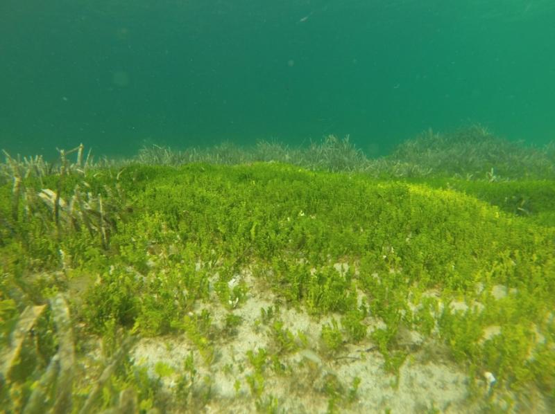 Fotografía donde se observa las praderas de Halimeda incrassata en los fondos de la isla de Cabrera. Autora: Rocío Jiménez-Ramos (investigadora del proyecto).