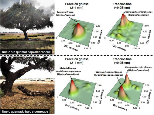 Los incendios alteran química y biológicamente la materia orgánica del suelo, pero no de manera homogénea, de tal forma que el efecto del fuego varía en función de factores como la profundidad y el tamaño de las partículas que lo forman. La fracción gruesa de los suelos estudiados estaba constituida mayoritariamente por compuestos de tipo fenólico, lo que se corresponde con restos vegetales poco transformados, mientras que en la fracción fina se acumulaban preferentemente compuestos con fórmulas típicas de derivados de proteínas y grasas, lo que se corresponde con una materia orgánica más transformada por procesos microbianos.