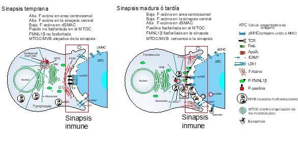 El reconocimiento del antígeno presentado en una célula presentadora de antígeno por parte del receptor de antígeno del linfocito T induce la formación de la sinapsis inmune. Tras formarse la sinapsis, se activa la proteína PKCdelta. Tanto FMNL1beta como paxilina son proteínas que regulan el ensamblaje y desensamblaje del citoesqueleto de actina, y cuando se activan mediante fosforilación (la adición de un grupo fosfato a las moléculas), a través de la proteína PKCdelta, producen un aumento de actina filamentosa en la sinapsis inmune, tras lo que se produce una disminución de actina filamentosa en el centro de la sinapsis inmune, dejando un hueco (Figs 1 y 2).