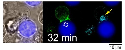 Fig. 2: Reorganización de la actina filamentosa y polarización de cuerpos multivesiculares (MVB) en la sinapsis inmune. El clon Jurkat control C3 que co-expresa GFP-actina (verde) y CFP-CD63 (cian), para marcar MVB, se desafió con células Raji pulsadas con superantígeno SEE marcadas con CMAC (azul) y se obtuvieron imágenes mediante microscopía de fluorescencia en time-lapse (3 fps). Panel izquierdo, canales de transmitancia y CMAC; panel central, canales de GFP-actina y CMAC; panel derecho, canales CFP-CD63 y CMAC. Se observa la subida inicial de actina filamentosa (F-actina) que se produce tras el contacto sináptico debido a la reorganización de actina en el centro de la sinapsis inmune, seguido de la eliminación de la actina filamentosa en el centro de la sinapsis inmune (flecha blanca) y la polarización simultánea de MVB (vesículas de color cian) hacia la sinapsis (flecha amarilla). Marcado CMAC de células Raji en azul, CFP-CD63 en cian y GFP-actina en verde / Manuel Izquierdo