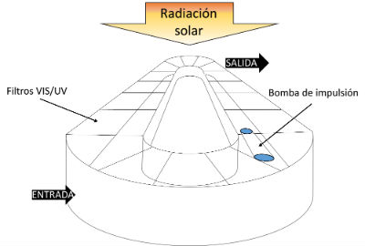 Sistema ADVANSIST. Fotobiorreactor anaerobio tipo carrusel. El agua residual se alimenta lateralmente. El agua se circula en el reactor y el efluente tratado se evacúa por el extremo opuesto. El sistema cuenta con una cubierta que selecciona la longitud de onda incidente, dejando paso únicamente a la luz infrarroja, además de garantizar un ambiente anaerobio.