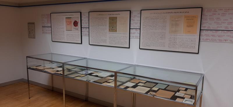 Paneles y vitrinas dedicados a las tres Españas en las que desarrollaron sus actividades los científicos españoles entre 1936 y 1939