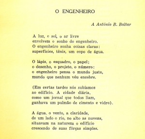 Joao Cabral está considerado como uno de los más grandes poetas brasileños del siglo XX. (Ver Nota 1). En 1945 apareció su libro O Engenheiro (El ingeniero). Según el poeta español Ángel Crespo (1926-1995), que trató y tuvo amistad con Cabral, en este libro: “… se inicia un proceso cuyo desarrollo tendrá una importancia decisiva: los temas tratados no proceden ya del mundo de los sueños, como sucedía en Pedra do Sono, sino de la realidad de la que el poeta se sirve, tomando así por primera vez contacto con lo real, en función del problema que pretende plantear y que no es otro que el del origen, fin y existencia actual de la poesía.”