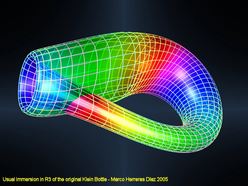 Siguiendo la analogía con la cinta de Moebius cabe preguntarse si hubiera una manera de pegar los dos círculos frontera del cilindro de manera que la superficie resultante tenga una sola cara, en otras palabras, que no divida al espacio en dos regiones separadas. Una posibilidad consiste en taladrar un orificio en el cilindro e introducir a su través uno de sus extremos para unirlo luego por dentro con el otro. Se obtiene así un objeto curioso, una especie de botella compacta que carece de interior y que, como le ocurre a la banda de Moebius, tampoco permite ser orientada.