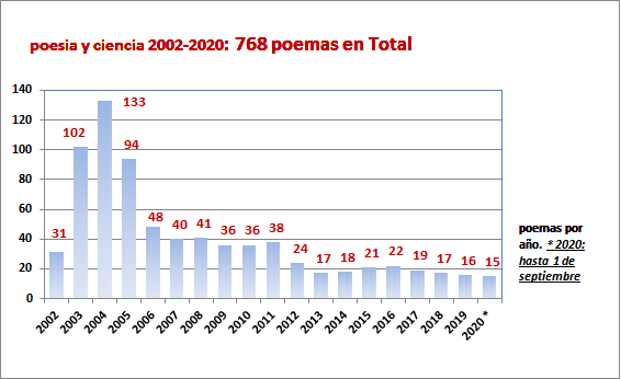 En estos 18 años se han seleccionado e incluido en poesía y ciencia un total de 768 poemas distintos, con la distribución por años que se muestra en el siguiente cuadro. (Nota 2).
