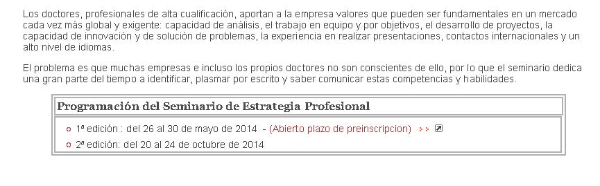 Desde la Oficina de Jóvenes Investigadores de madrimasd estamos muy contentos de poder anunciaros que este año volvemos a organizar el Seminario de Estrategia Profesional. Como siempre, se trata de una actividad gratuita. El seminario está dirigido a doctores y jóvenes investigadores en general y cuenta con un completo programa que irá desgranando, a lo largo de 5 mañanas, las claves para orientarse profesionalmente hacia el mercado laboral. Para ser eficaz en esa reconversión es imprescindible pasar por varias fases, como estudiar el mercado, diagnosticar nuestros objetivos, detectar nuestras fortalezas y aprender a comunicarlas. En el Seminario de Estrategia Profesional enseñamos a todo esto y más.