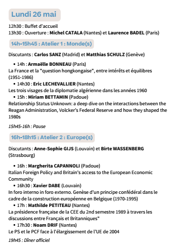 – Atelier 1: Monde(s), que reunirá trabajos sobre diplomacia y política internacional en distintos contextos históricos, desde la “cuestión hongkonesa” en la política exterior francesa hasta la diplomacia argelina en los años sesenta o las relaciones entre la administración Reagan y la Reserva Federal durante la década de 1980.