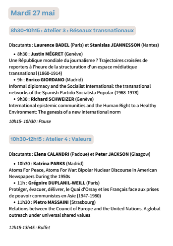 – Atelier 4: Valeurs, centrado en la dimensión normativa de las relaciones internacionales, con investigaciones sobre discursos nucleares durante la Guerra Fría, la protección de ciudadanos en Asia tras la expansión comunista o las relaciones entre el Consejo de Europa y las Naciones Unidas.