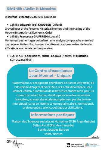La edición de 2025 está organizada por el Centre de Recherche en Histoire Internationale et Atlantique (CRHIA) de Nantes Université y cuenta con el apoyo del Centro de Excelencia Jean Monnet UniPaix, una iniciativa dedicada a promover investigaciones interdisciplinarias sobre la paz y la integración europea.