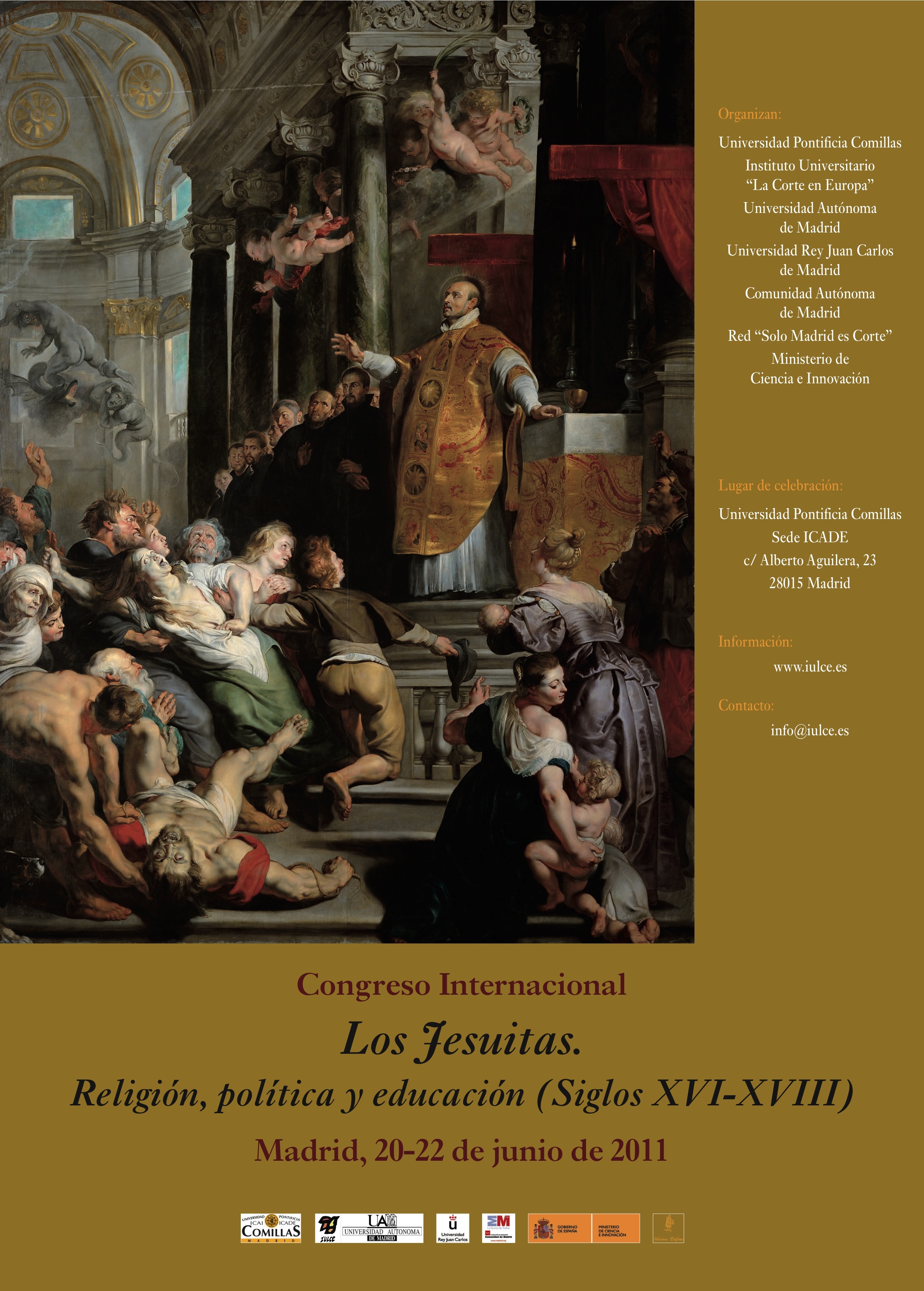LOS JESUITAS. Religión, política y educación (Siglos XVI-XVIII)Javier Revilla Canora11 abril 2011Eventos, General, Investigaciones actuales, Noticias Del 20 al 22 de junio, se celebrará el Congreso Internacional «Los Jesuitas. Religión, política y educación (siglos XVI-XVIII). Más información en: www.iulce.es (PROGRAMA Y FOLLETO DE INSCRIPCIÓN) Compartir:
