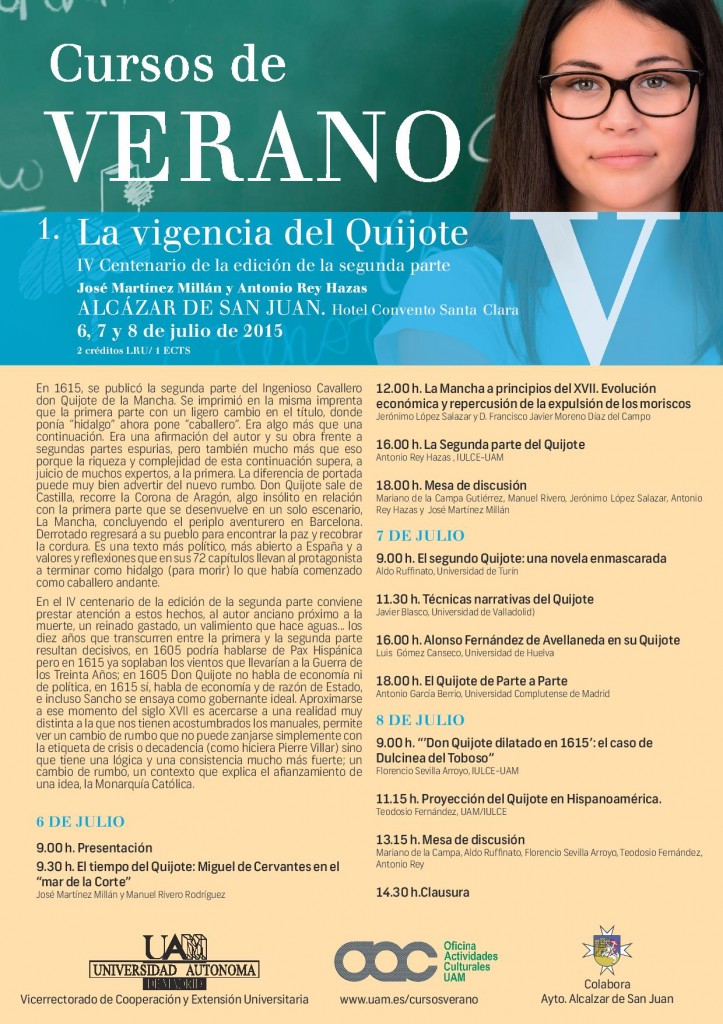 El Instituto Universitario «La Corte en Europa», como cada año, organiza un Curso de Verano en la localidad de Alcázar de San Juan. Como en ediciones anteriores, este año hemos escogido esta temática ya que celebramos en IV centenario de la publicación de la segunda parte del famoso libro de Miguel de Cervantes. Y como siempre, contaremos con importantes especialistas en el campo de la Literatura y la Historia, que analizarán el trasfondo político y social que se esconde en esta segunda parte.