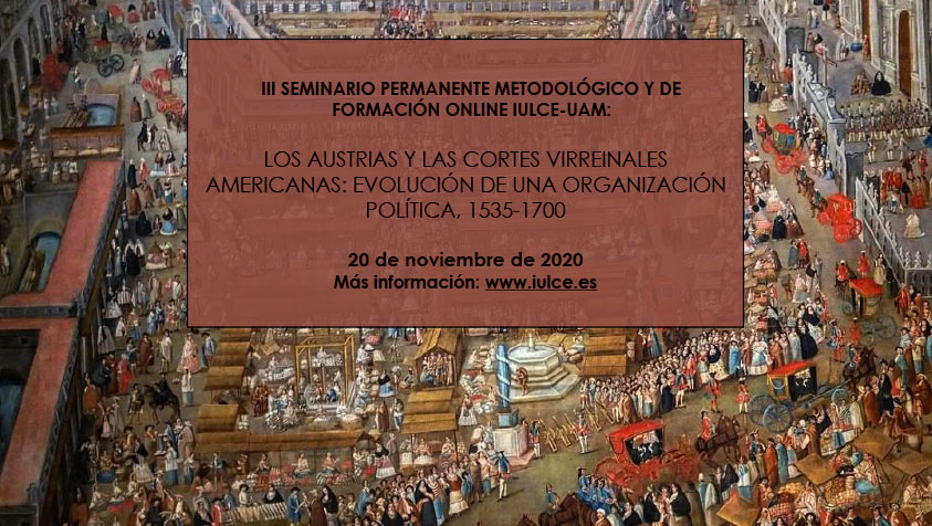 Ya está disponible el programa del próximo Seminario Permanente Metodológico y de Formación del IULCE. En esta ocasión, el seminario versará sobre las cortes virreinales americanas, y contará con la participación de los profesores Iván Escamilla González (Universidad Nacional Autónoma de México), Alejandro Cañeque (University of Maryland), Margarita Suárez Espinosa (Pontificia Universidad Católica del Perú), Manuel Hernández González (Universidad de La Laguna) y Juan Jiménez Castillo (IULCE-UAM).