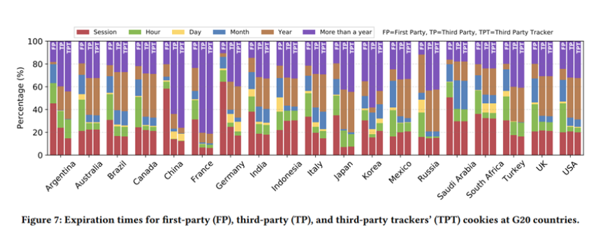 Figura 7. Tiempos de caducidad de las cookies de origen (FP), de terceros (TP) y de terceras partes rastreadoras (TPT) en los países del G20.