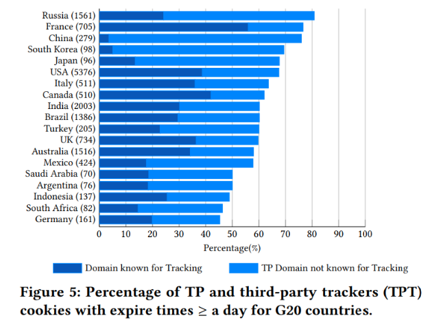 Figura 5. Porcentaje de cookies de terceros (TP) y terceras partes rastreadoras (TPT) con tiempos de expiración ≥ un día para los países del G20.