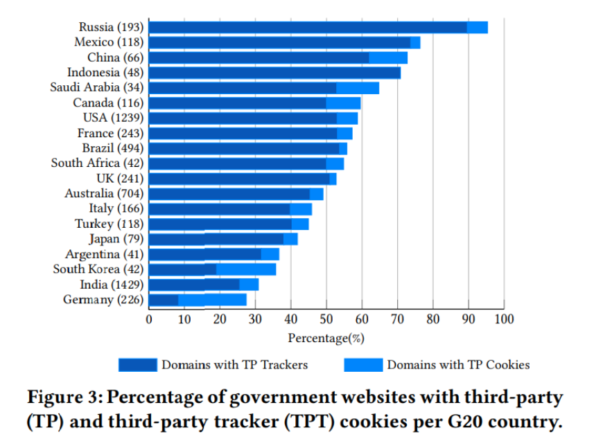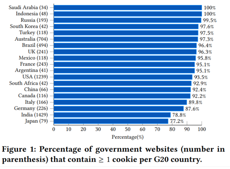Figura 1. Porcentaje de sitios web gubernamentales (número entre paréntesis) que contienen ≥ 1 cookie por país del G20.