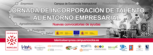 El CEI Campus Moncloa organiza la jornada Incorporación de Talento al Entorno Empresarial: Nuevas Convocatorias de Ayudas con las Plataformas Tecnológicas más importantes en el área de la agroalimentación y la salud durante la mañana del viernes 6 de marzo de 2015 en el Salón de Actos de la Facultad de Veterinaria de la Universidad Complutense de Madrid, y promovido por el Clúster de Agroalimentación y Salud y la Plataforma Vet+i.