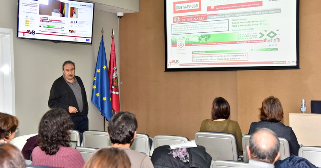 Pablo Elpidio Hernández Cruza y Rosario Martín de Santos realizaron la presentación de los hitos conseguidos por grupo investigador del Depatamento de Nutrición, Bromatología y Tecnología de los Alimentos de la Facultad de Veterinaria de la Universidad Complutense de Madrid. En sus intervenciones se mostraron los resultados obtenidos en la obtención de microorganismos y/o péptidos de interés nutracéutico, los avances logrados en el control de patógenos zoonósicos y antibioresistencias en la microbiota intestinal mediante el diseño de dietas funcionales, y los resultados conseguidos en la detección de alergenos vegetales en alimentos.