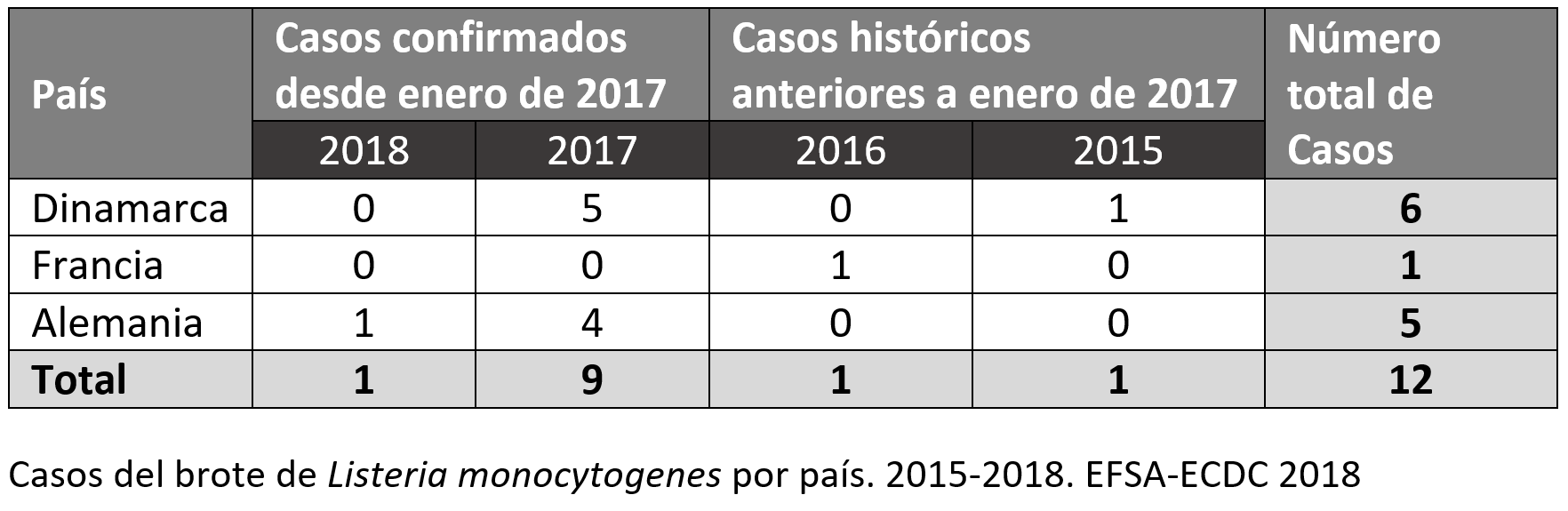 Hasta octubre de 2018, se han notificado 12 casos (incluidas cuatro muertes) desde que en agosto de 2017, Dinamarca informara sobre el primer grupo de casos relacionados con el consumo de salmón ahumado listo para el consumo producido en Polonia. Desde entonces se han implementado medidas de control e informado a los estados miembros de la UE y autoridades competentes. En octubre de 2017, Francia informó de la detección de la misma cepa de Listeria en salmón marinado procedente de la misma empresa procesadora polaca que se identificó en la investigación del brote danés. El caso más reciente relacionado con el brote se notificó este mismo año en Alemania. La identificación de la misma cepa de Listeria en los recientes casos sugiere que la fuente de contaminación aún puede estar activa y que los productos contaminados se han distribuido a otros países de la UE.