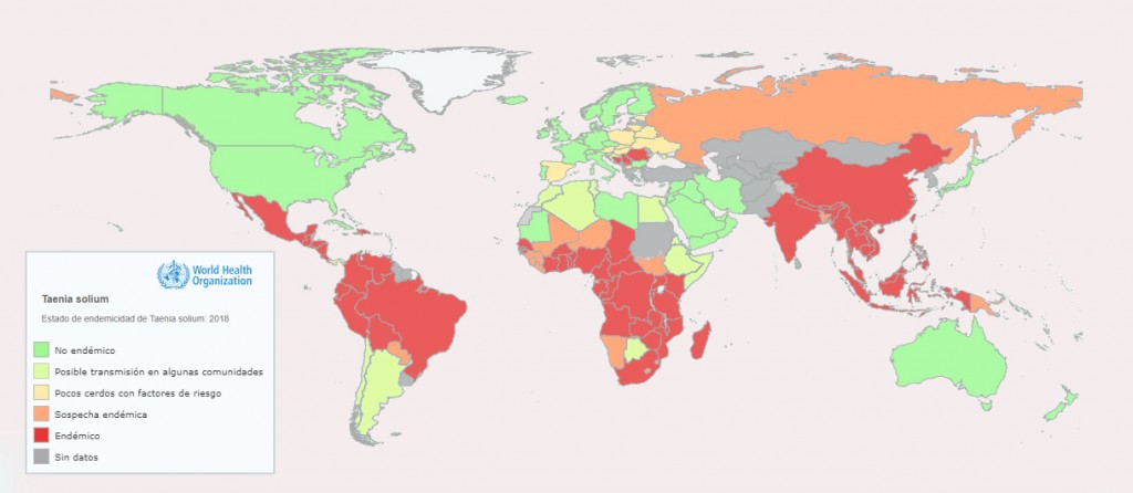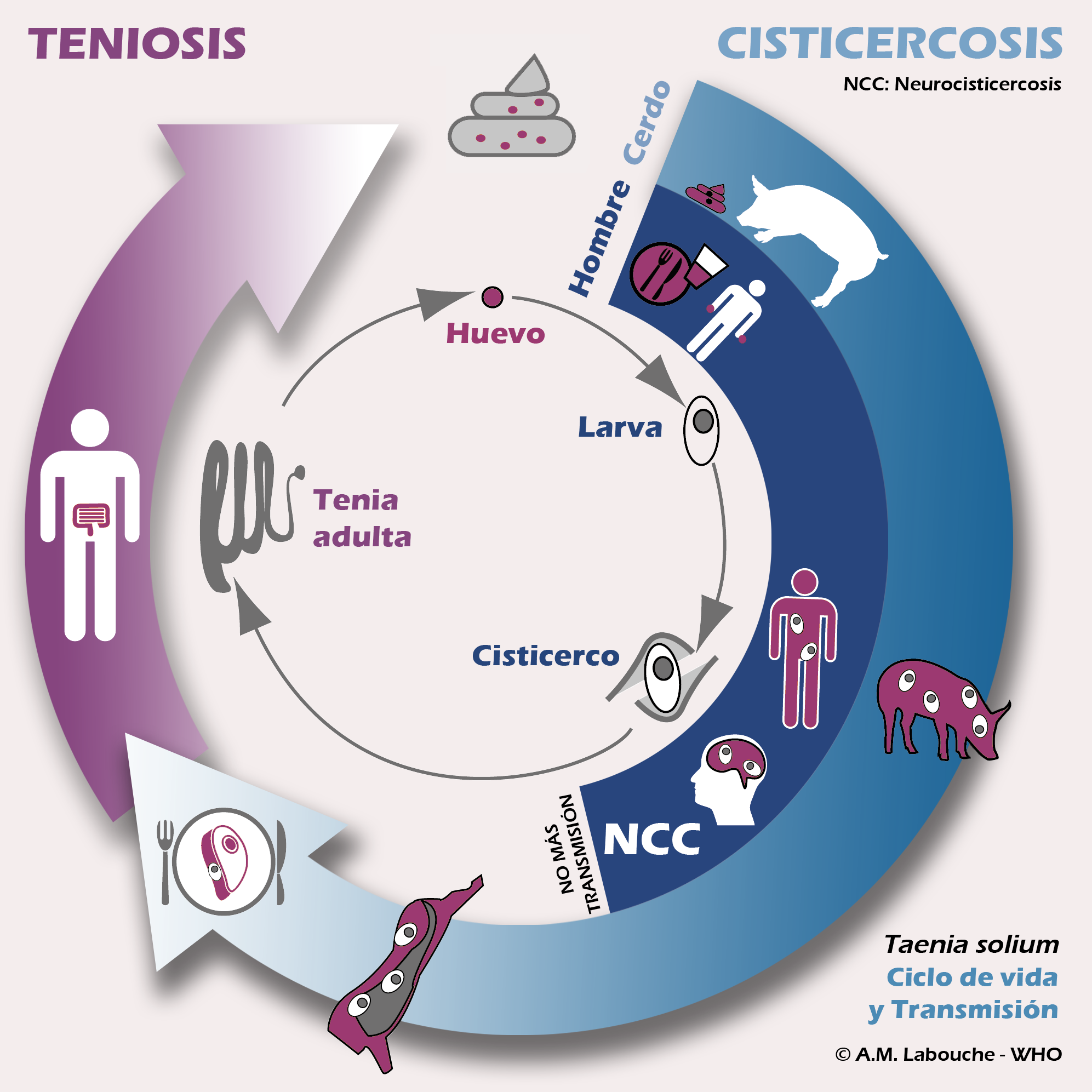 La teniois y la cisticercosis son dos enfermedades causadas por cestodos incluidas en la lista de NTD como transmisibles por los alimentos. Si bien las especies de tenias que pueden causar enfermedad en humanos son tres: Taenia solium (presente en cerdo en su forma larvaria), Taenia asiática (cerdo) y Taenia saginata (ganado bovino), solo T. solium causa problemas de salud importantes.
