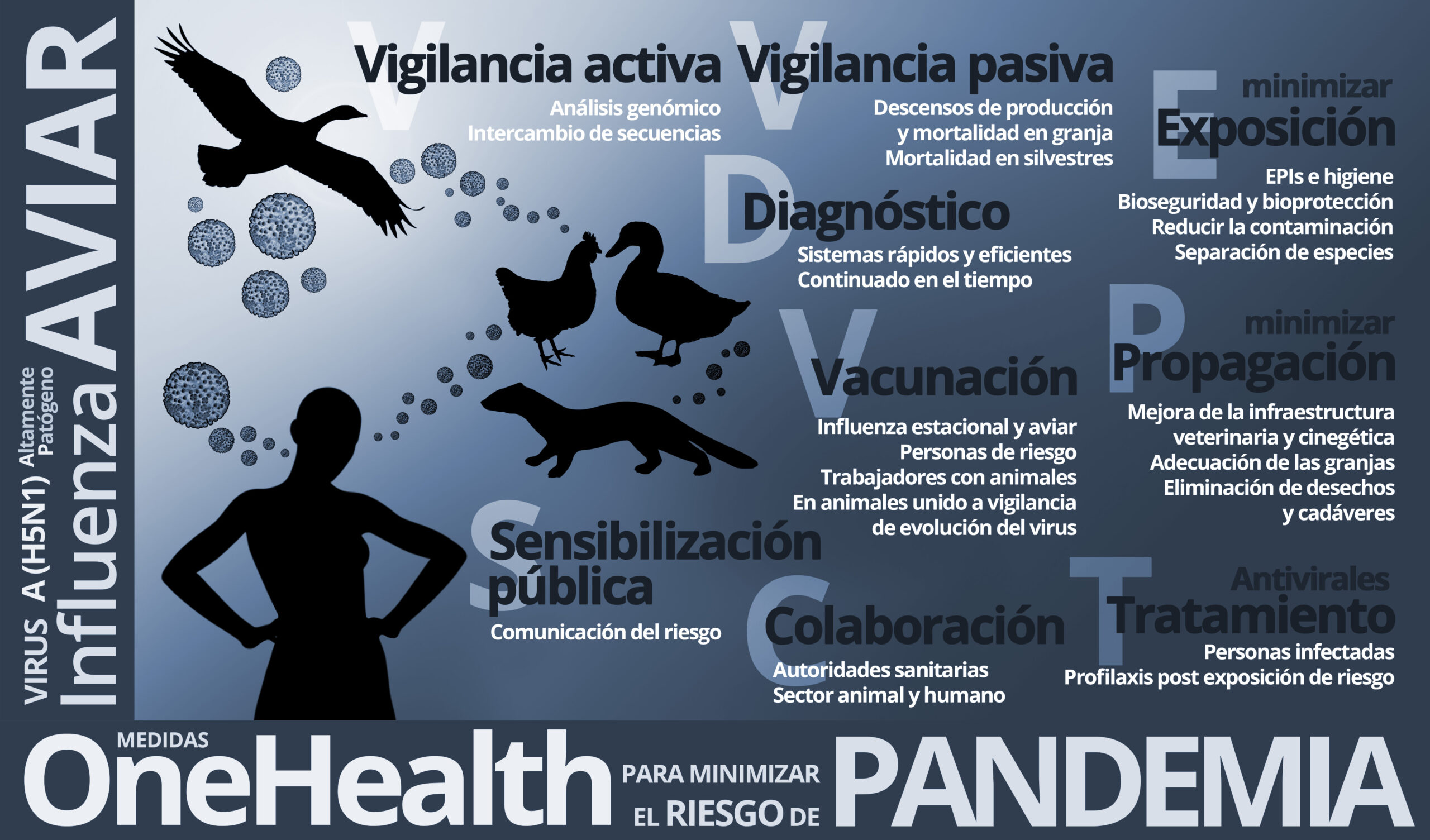 Las medidas de mitigación del riesgo de aparición de virus de influenza aviar adaptados a mamíferos y seres humanos deben tener como objetivo limitar la exposición y prevenir su propagación. El siguiente gráfico resume las medidas a adoptar: