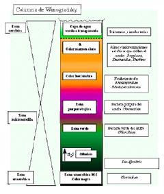 En primer lugar se establece un gradiente de oxígeno. La zona más baja de la columna es la zona anaerobia (sin oxígeno) y adquirirá un color negruzco. En esta zona se desarrollan los anerobios estrictos como Clostridium que digiere la celulosa en glucosas y las usará mediante fermentación produciendo compuestos orgánicos simples como el etanol, ácido acético,… Éstos serán usados por bacterias del género Desulfovibrio como alimento mientras respira anaeróbicamente usando el sulfato que le hemos suplementado. Esto generará H2S que, en parte, reaccionará con el hierro del sedimento dando sulfuro ferroso, responsable del color negro. Otra parte del H2S difunde hacia arriba creando otro gradiente que se superpone al del oxígeno.