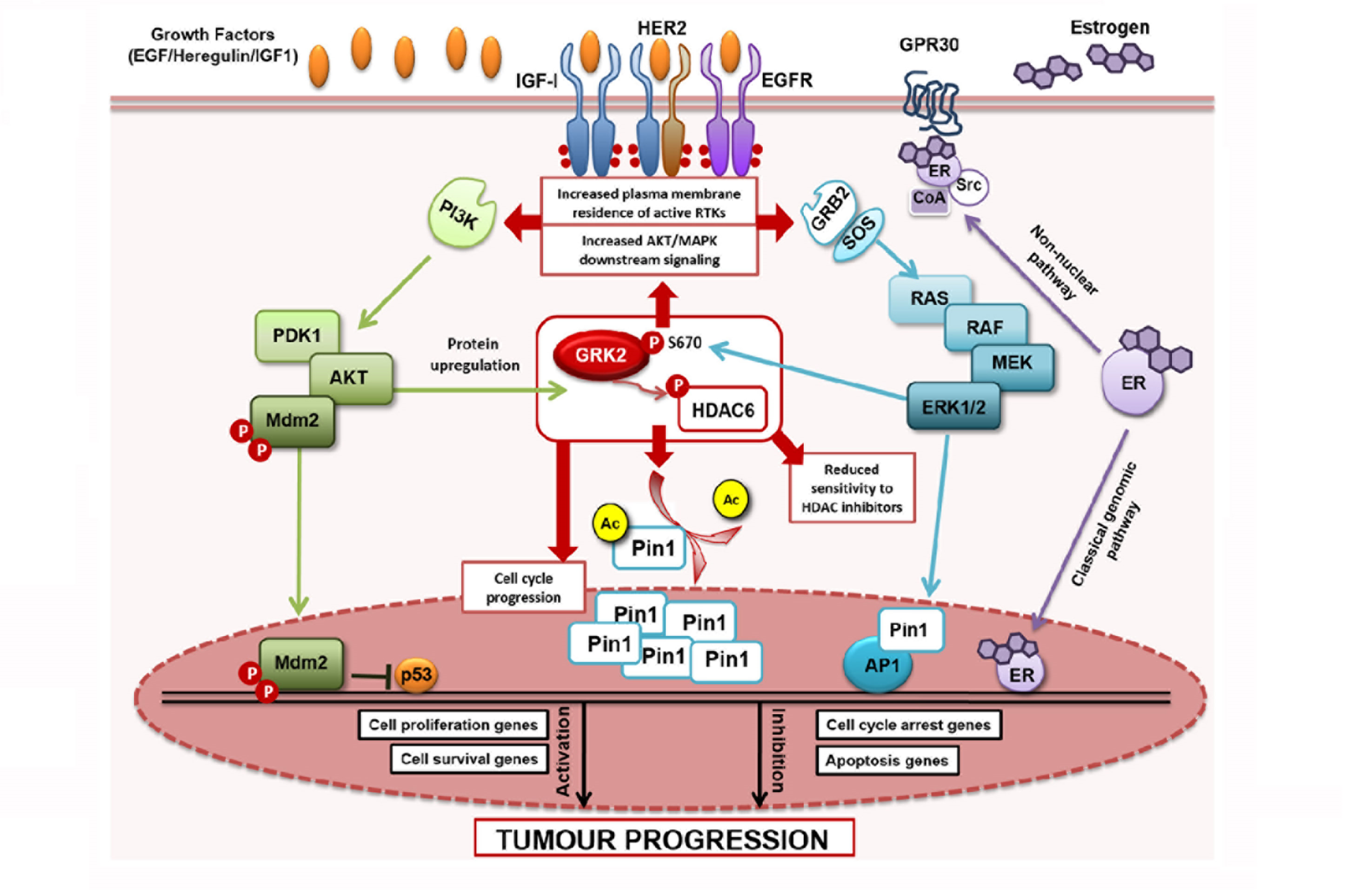 Por lo tanto, es fundamental encontrar nuevas dependencias moleculares en el crecimiento y la viabilidad de las células cancerosas con el fin de detener la progresión de la enfermedad. Con este objetivo, Laura Nogués y colaboradores han identificado la sobreexpresión de la quinasa GRK2 en modelos experimentales de cáncer de mama y en pacientes con carcinoma ductal. Esta proteína estimula el crecimiento tumoral regulando la actividad de HDAC6 y Pin1, dos factores claves en la señalización oncogénica de células tumorales de mama tanto luminales como basales. La modificación de HDAC6 por GRK2 permite la deacetilación y la activación de Pin1, lo cual estimula numerosos factores mitóticos y la proliferación celular.