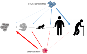 En esta historia nos falta el proceso celular por el cual se identificó por primera vez la senescencia, el acortamiento de los telómeros -el extremo final de los cromosomas-, historia sobre la que ya hemos tratado en reiteradas ocasiones. Después de un número limitado de divisiones, los telómeros llegan a un acortamiento crítico que será reconocido por la célula como daño. En este momento se activa el programa de parada en la proliferación. La célula afectada no podrá dividirse más. Es la senescencia replicativa, y que esto suceda, vuelve a ser bueno el organismo en su conjunto. Con el tiempo, con la edad, estas células se van acumulando, volviendo a tener el mismo problema que antes, dónde la acumulación no es buena. Se termina por crear un entorno nocivo (proinflamatorio), donde se, digamos, “convencen” a otras células para que se vuelvan como ellas e incluso se genera un entorno propicio para el crecimiento de tumores. El sistema inmune debe eliminarlas, pero como se ha comentado antes, con la edad, se pierde eficacia.