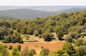 Foto 1. Bosque mediterráneo en el Parque Natural del Alto Tajo (Guadalajara, Mayo de 2008). El bosque mediterráneo ha sido gestionado desde tiempos inmemoriales, pero su gestión ha ido cambiando mucho con el tiempo. El abandono rural en esta área está generando la disminución de espacios abiertos y cultivos, con directos y negativos impactos sobre la biodiversidad regional en grupos emblemáticos como las aves, y, en concreto, las rapaces. Pero aun conocemos mal la relación entre gestión y biodiversidad en estos sistemas tal como ocurre para la mayoría de los bosques europeos. (Fotografía de Fernando Valladares)