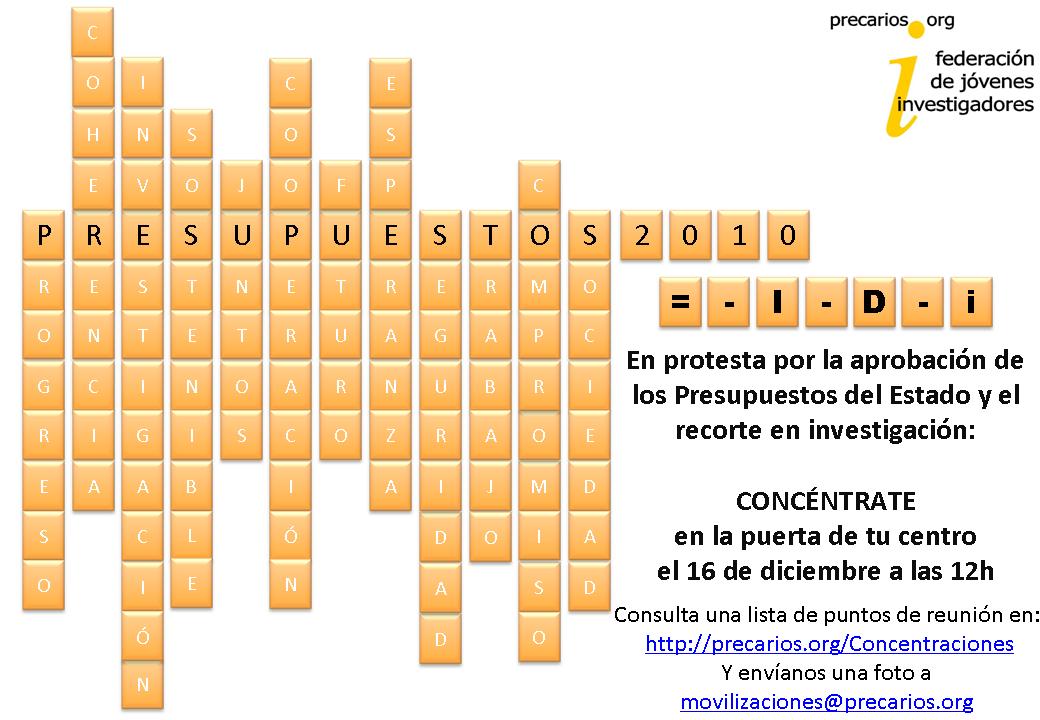Por varias fuentes me he enterado de que la Federación de Jóvenes Investigadores / Precarios, junto a otras asociaciones y sociedades científicas ha convocado para el próximo miércoles 16 de Diciembre concetraciones delante de los centros de investigación, en protesta por el recorte presupuestario en I+D+i (Investigación + Desarrollo + innovación) y a favor de la ciencia y de una carrera investigadora desarrollada en condiciones dignas.