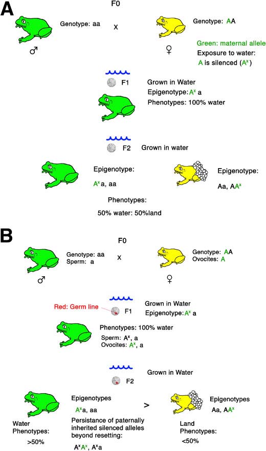 En su experimento de hibridación, Kammerer podría haber tomado para su F0 un macho aa (acuático) y una hembra AA (terrestre). Como el macho es acuático, podemos asumir que los huevos se dejaron en agua (si bien esto no puede confirmarse en el libro de Kammerer). Todos los embriones de esta F1 serían entonces heterozigóticos. Durante el desarrollo embrionario, tanto sus células somáticas como las germinales estarían expuestas al agua. En todos los embriones, el alelo A se heredaría de la madre y se silenciaría (por estar expuesto al agua). Como resultado, todos los embriones de la F1 tendrían el epigenotipo Axa que daría lugar a fenotipos acuáticos. El cruzamiento entre sapos de la F1, teniendo en cuenta que la mayoría de las metilaciones se borrarían después de la fertilización, daría genotipos en la F2 con la proporción ¼ AA, ¼ Aa, con el alelo paterno A, ¼ Aa, con el alelo materno A, ¼ aa. Como los dos parentales serían acuáticos, entonces los huevos de la F2 crecerían en agua produciendo epigenotipos en la proporción ¼ Axa, ¼ Aa, ¼ Axa y 1/4 aa, lo cual está próximo a la proporción 3:1 de Kammerer en la F2 considerando que trabajaba en una especie no-modelo con bajos números de indivíduos. De todos modos, la proporción se desplazaría hacia una mayor cantidad de sapos de agua (más próximo a la proporción 3:1) si algunos de los alelos silenciados en la F1 permaneciesen silenciados más allá de la fase de “formateado” después de la fertilización.