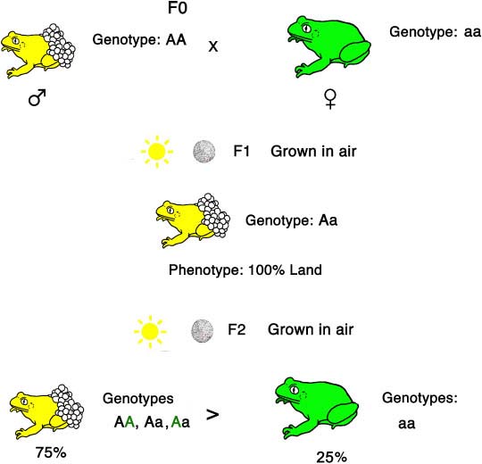 El modelo propuesto es consistente con los cruzamientos descritos de un macho AA de tierra con una hembra aa acuática (Figura 4). La F1 resultante sería Aa, con el alelo dominante paterno y por tanto se desarrollaría como fenotipo terrestre. Ambos, machos y hembras de la F1 tendrían fenotipos terrestres y se aparearían en tierra. Por tanto los huevos de la F2 no se expondrían al agua. Los genotipos resultantes serían ¼ AA, ½ Aa y ¼ aa, una proporción típicamente mendeliana como publicó kammerer (Fig 4).