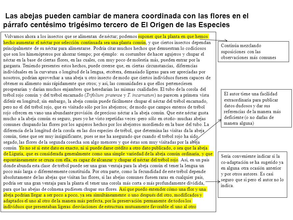 Las abejas pueden cambiar de manera coordinada con las flores en el párrafo centésimo trigésimo tercero de El Origen de las Especies