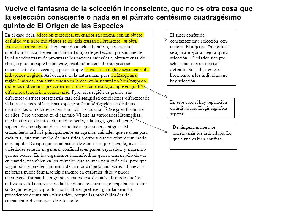 Vuelve el fantasma de la selección inconsciente, que no es otra cosa que la selección consciente en el párrafo centésimo cuadragésimo quinto de El Origen de las Especies