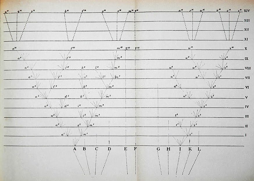 Pero he de hacer observar aquí que no supongo yo que el proceso continúe siempre tan regularmente como está representado en el cuadro -aunque éste es ya algo irregular-, ni que se desarrolle sin interrupción; es mucho más probable que cada forma permanezca inalterable durante largos períodos y experimente después otra vez modificación. Tampoco supongo que las variedades más divergentes, invariablemente se conserven; con frecuencia, una forma media puede durar mucho tiempo y puede o no producir más de una forma descendiente modificada; pues la selección natural obra según la naturaleza de los puestos que estén desocupados, u ocupados imperfectamente, por otros seres, y esto dependerá de relaciones infinitamente complejas. Pero, por regla general, cuanto más diferente pueda hacerse la conformación de los descendientes de una especie, tantos más puestos podrán apropiarse y tanto más aumentará su descendencia modificada. En nuestro cuadro, la línea de sucesión está interrumpida a intervalos regulares por letras minúsculas con número, que señalan las formas sucesivas que han llegado a ser lo bastante distintas para ser registradas como variedades. Pero estas interrupciones son imaginarias y podrían haberse puesto en cualquier punto después de intervalos suficientemente largos para permitir la acumulación de una considerable variación divergente.