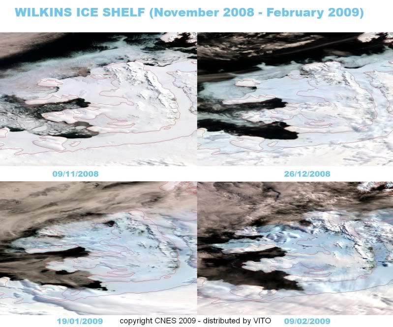 «La placa Wilkins había sido estable durante el siglo pasado. Los científicos investigan ahora qué procesos están interviniendo en las fracturas de placas heladas en la zona. En los últimos 50 años la temperatura media ha subido 2,5 grados centígrados. Otras nueve placas se han roto o retrocedido en la Antártida en el último medio siglo, como la Larsen A en 1995 o la Larsen B en 2002, modificando bruscamente los mapas del continente helado.»