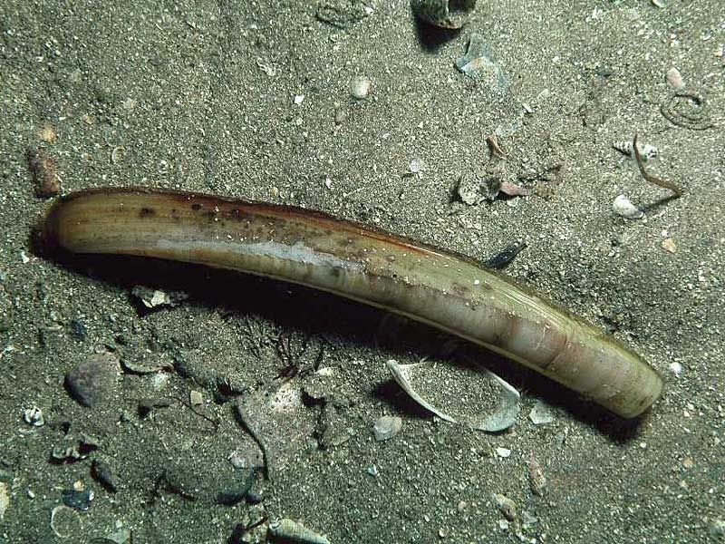 “La navaja es un molusco bivalvo marino de gran tamaño, sus valvas llegan a medir hasta 20 cm. de largo. Estas tienen forma alargada y algo curvada, su superficie es muy lisa y muestran un color amarillento con manchas rojizas, moradas o pardas.”