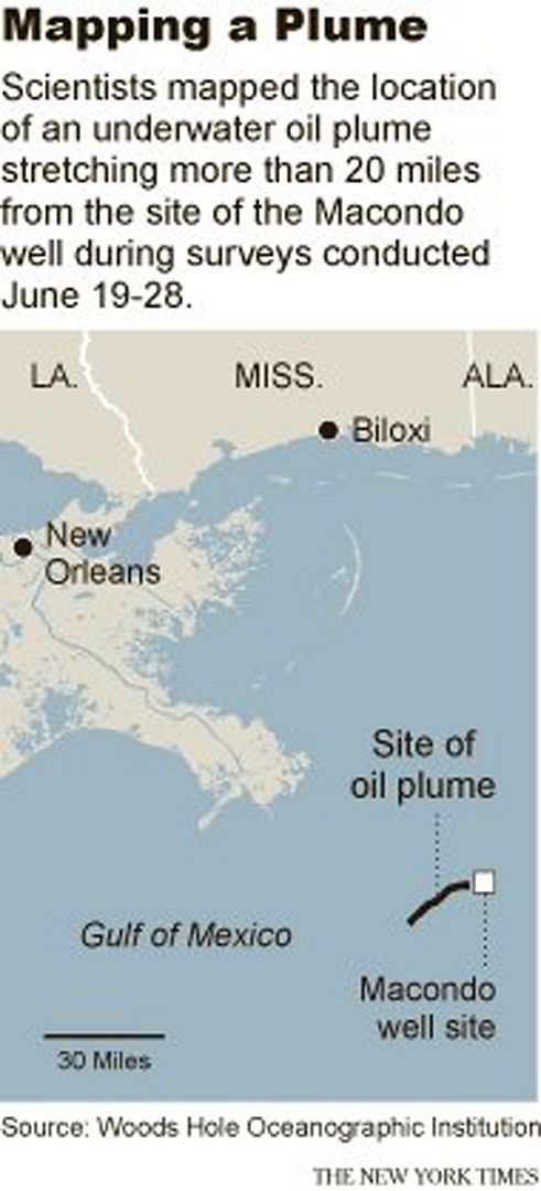 Un grupo de investigación de la Institución Oceanográfica Woods Hole (WHOI), acaba de publicar en Science que los 4,9 millones de barriles de petróleo que se vertieron al océano después del accidente en la plataforma hundida Deepwater Horizon crearon una inmensa columna de crudo del mismo tamaño que la isla de Manhattan, de 35 kilómetros de largo y 1,5 de ancho, situada a 1.100 metros de profundidad. El estudio, señala que la explosión y hundimiento de la plataforma petrolífera Deepwater Horizon el pasado abril creó una columna de residuos cuya degradación natural es muy lenta.
