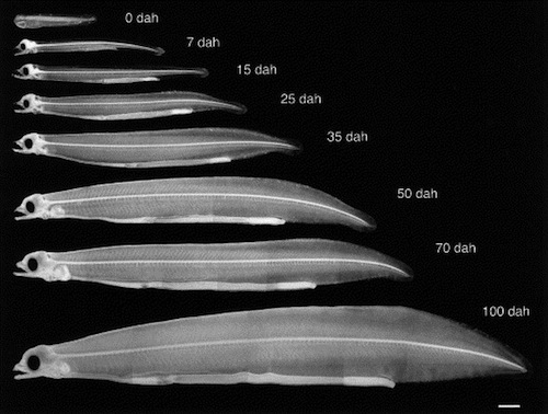 «De los huevos de anguila salen pequeñas larvas llamadas leptocéfalos, que se dejan arrastrar por las corrientes marinas a grandes distancias. Al acercarse a las costas de Norteamérica -al cabo de un año- o a las europeas -al cabo de, por lo menos, tres años-, se transforman en angulas, que penetran a millares en los ríos y nadan corriente arriba para establecerse en el curso alto, donde continúan creciendo. Cuando la anguila tiene ya catorce o quince años, cambia su coloración, para convertirse en una «anguila plateada» y emprender el largo viaje de regreso al mar de los Sargazos, sitio en que, finalmente se reproduce y muere.»